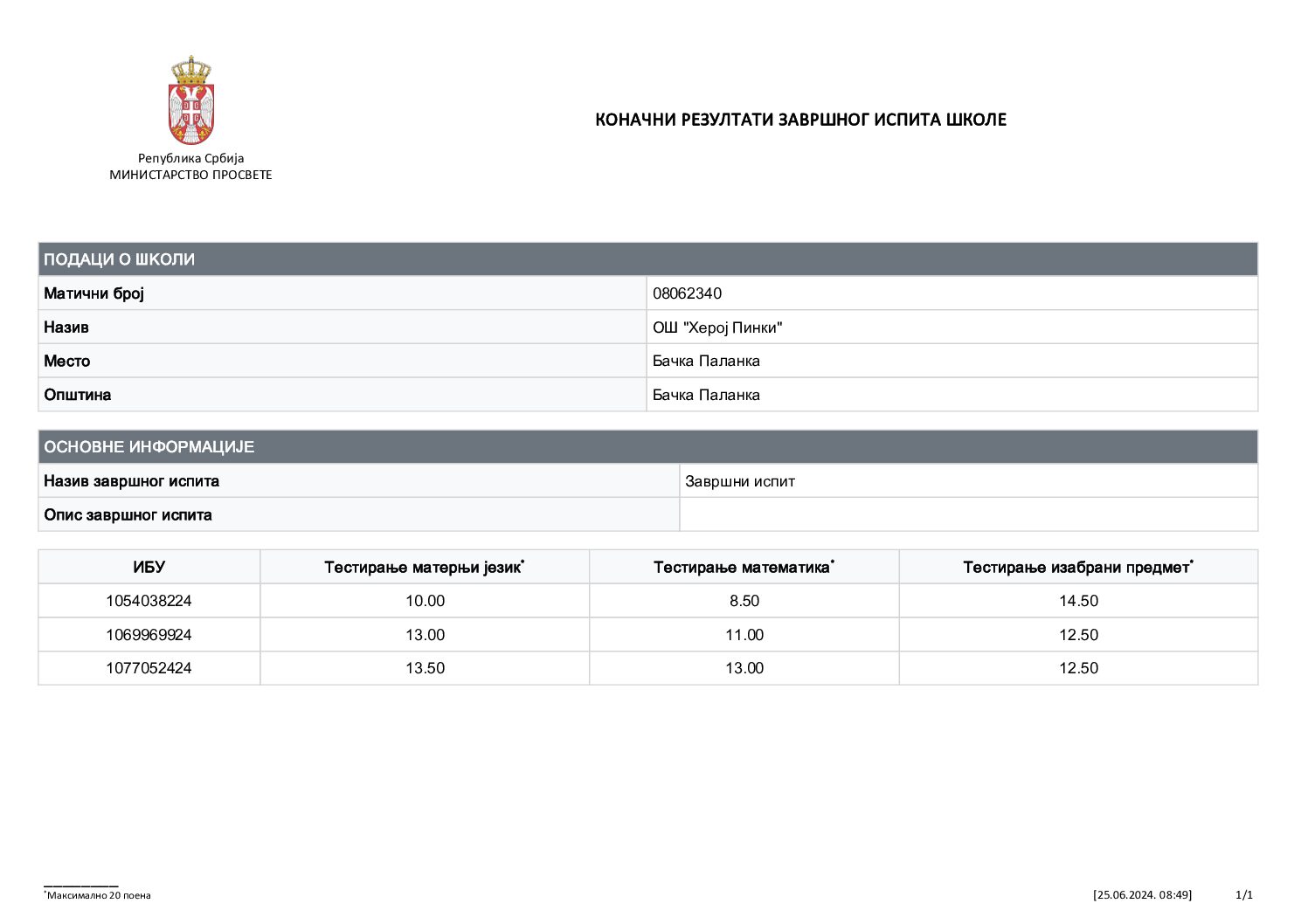 Резултати са завршних испита на крају школске 2024/2025. године